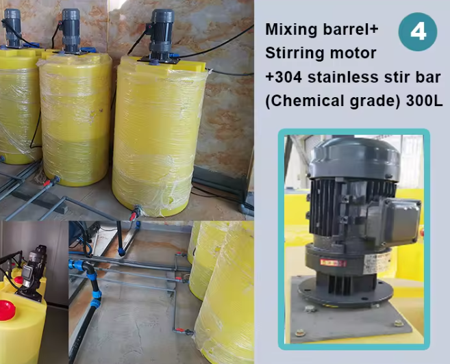 se observan barriles de mezcla equipados con motores agitadores y barras agitadoras de acero inoxidable 304 (grado químico) con una capacidad de 300 litros. Estos barriles son utilizados para mezclar y preparar la solución nutritiva que se suministra a las plantas en un sistema de riego. El motor asegura que la mezcla sea homogénea y la solución nutritiva esté bien disuelta.