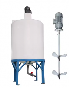 Este depósito es un sistema de mezcla hidropónico con agitador, soportado por una estructura metálica que facilita la dispensación de la solución nutritiva a través de una válvula en la base. Equipado con un motor y paletas de agitación, asegura una mezcla homogénea de nutrientes en solución. Es ideal para mantener la calidad de la solución nutritiva en sistemas de riego hidropónico automatizados.